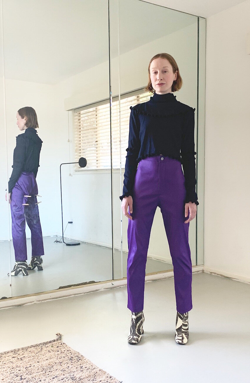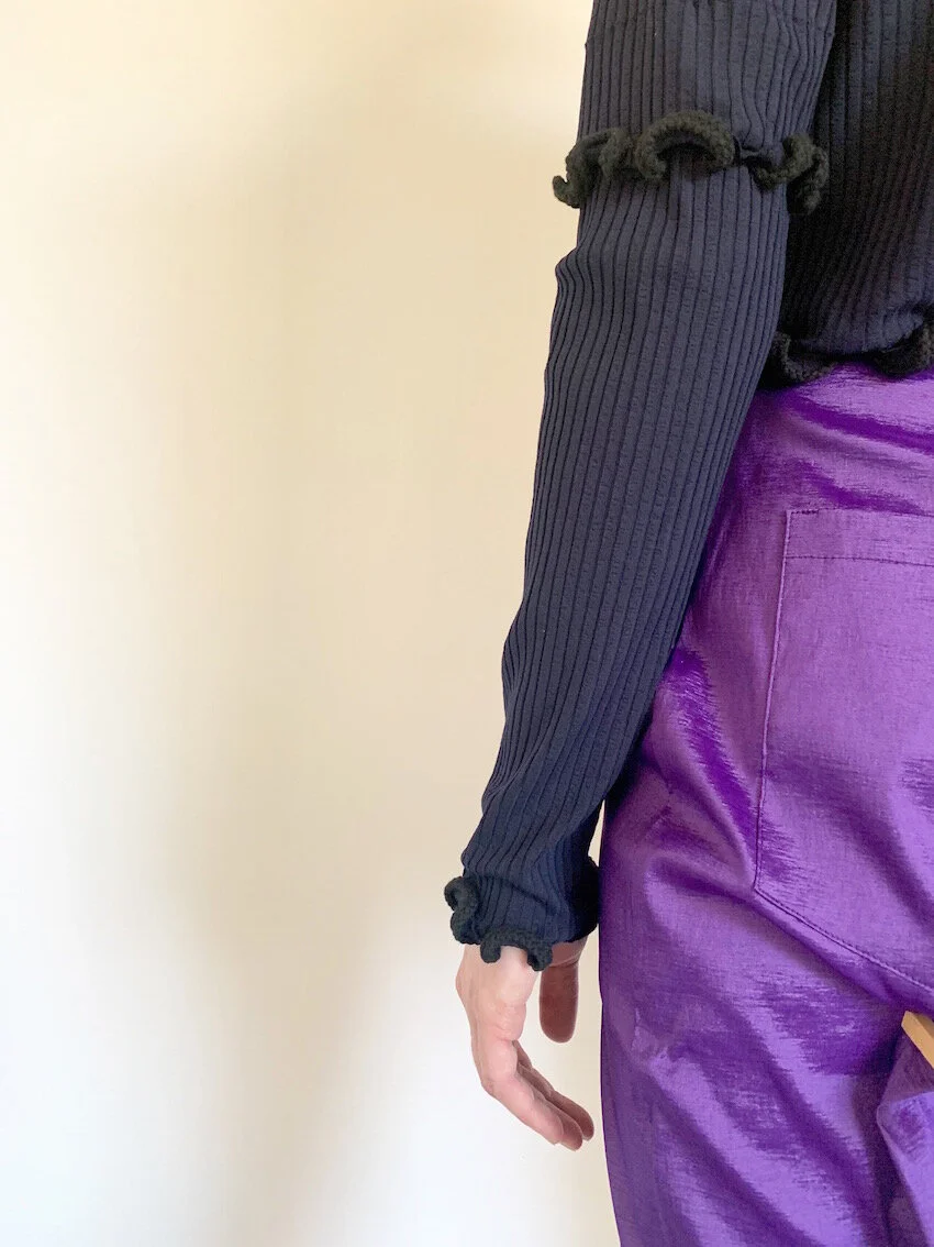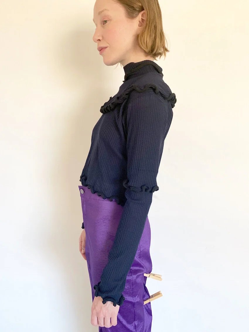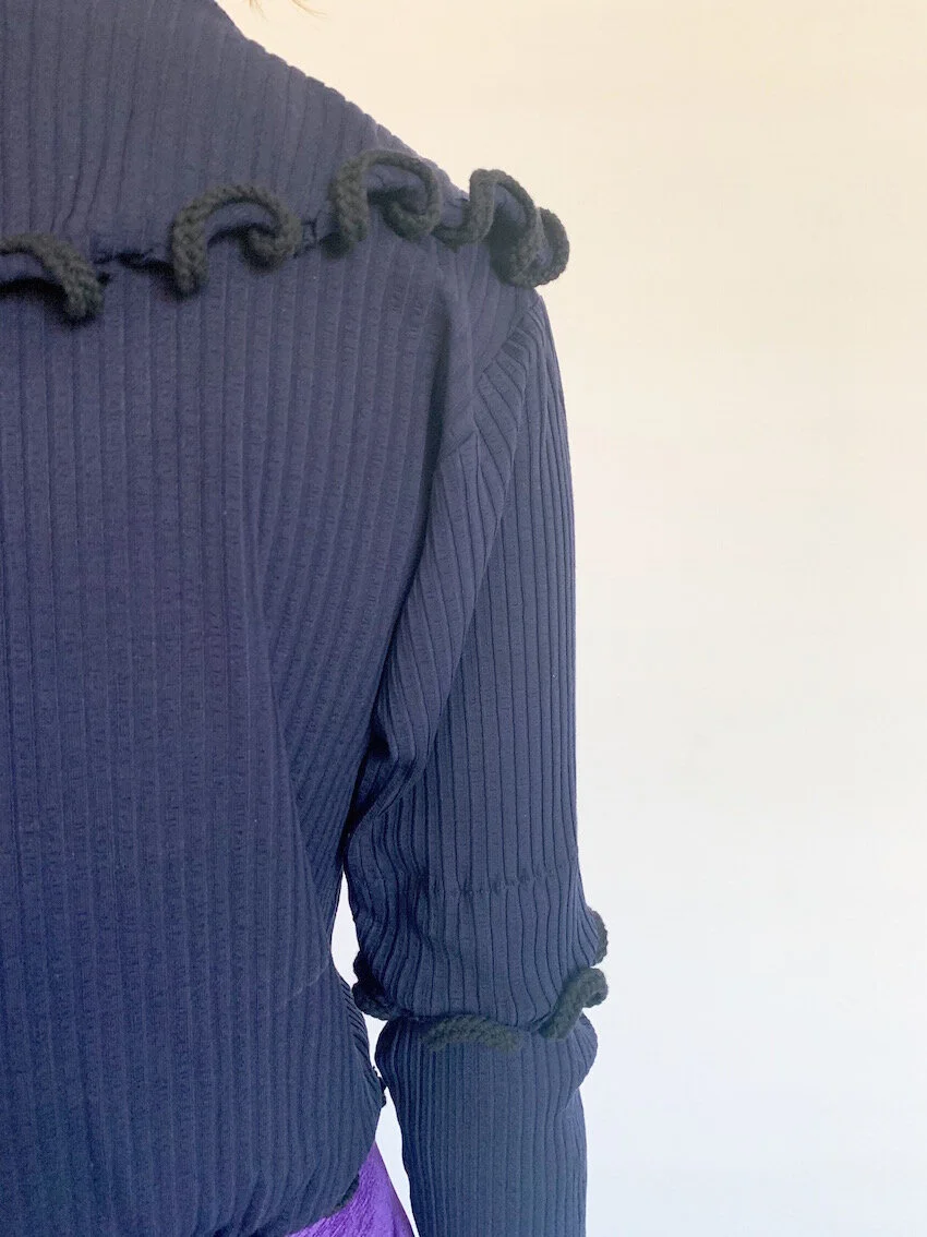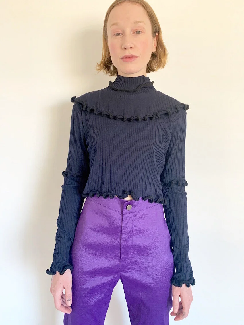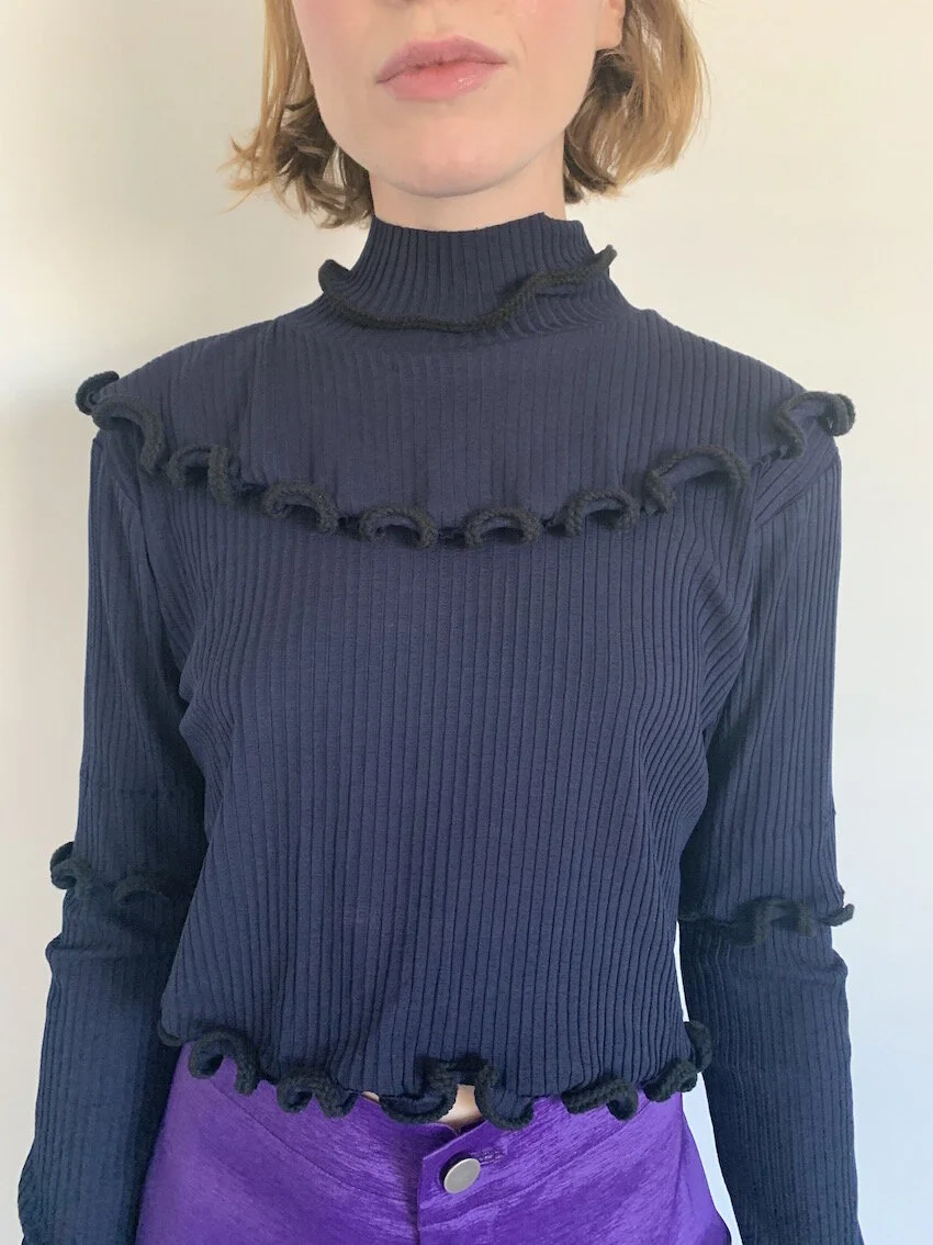 Slinky navy blue rib mock neck top with contrasting rope ruffle detailing throughout.