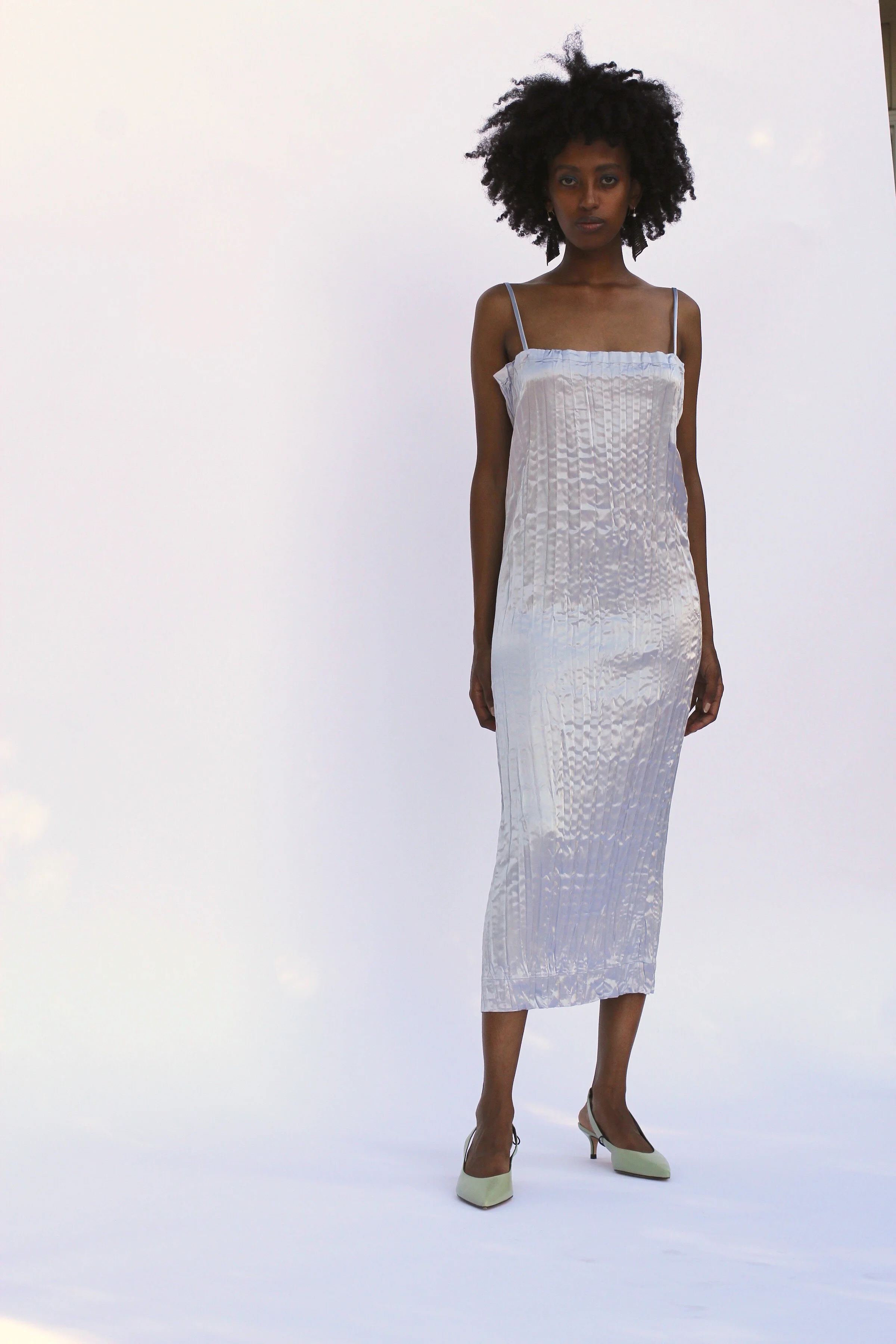Beautifully simple Silver satin crinkle Slip Dress with thin Shoulder Straps